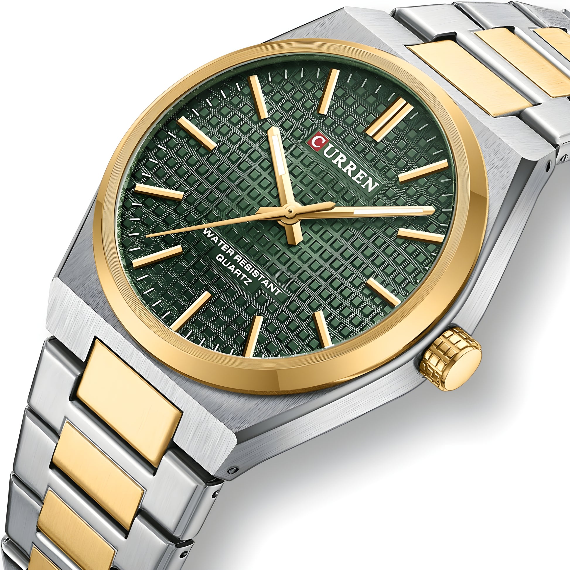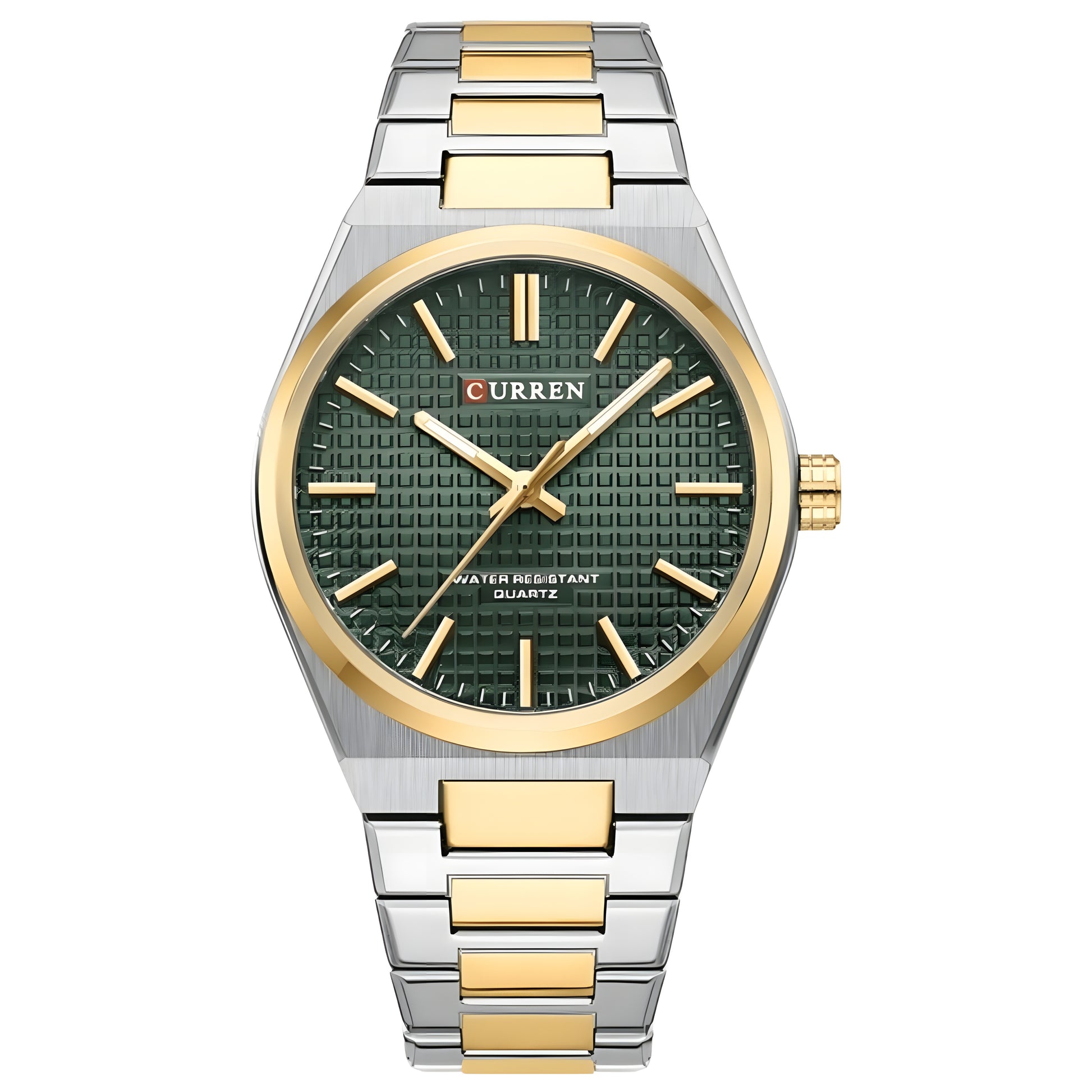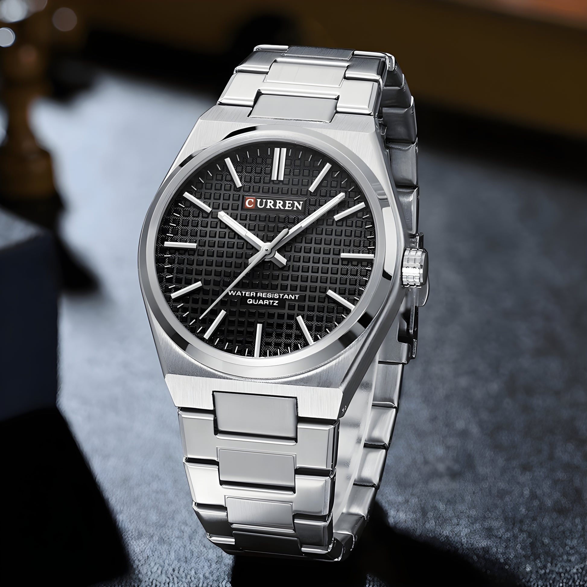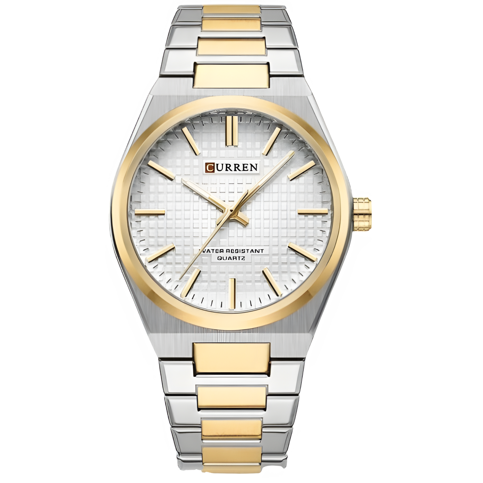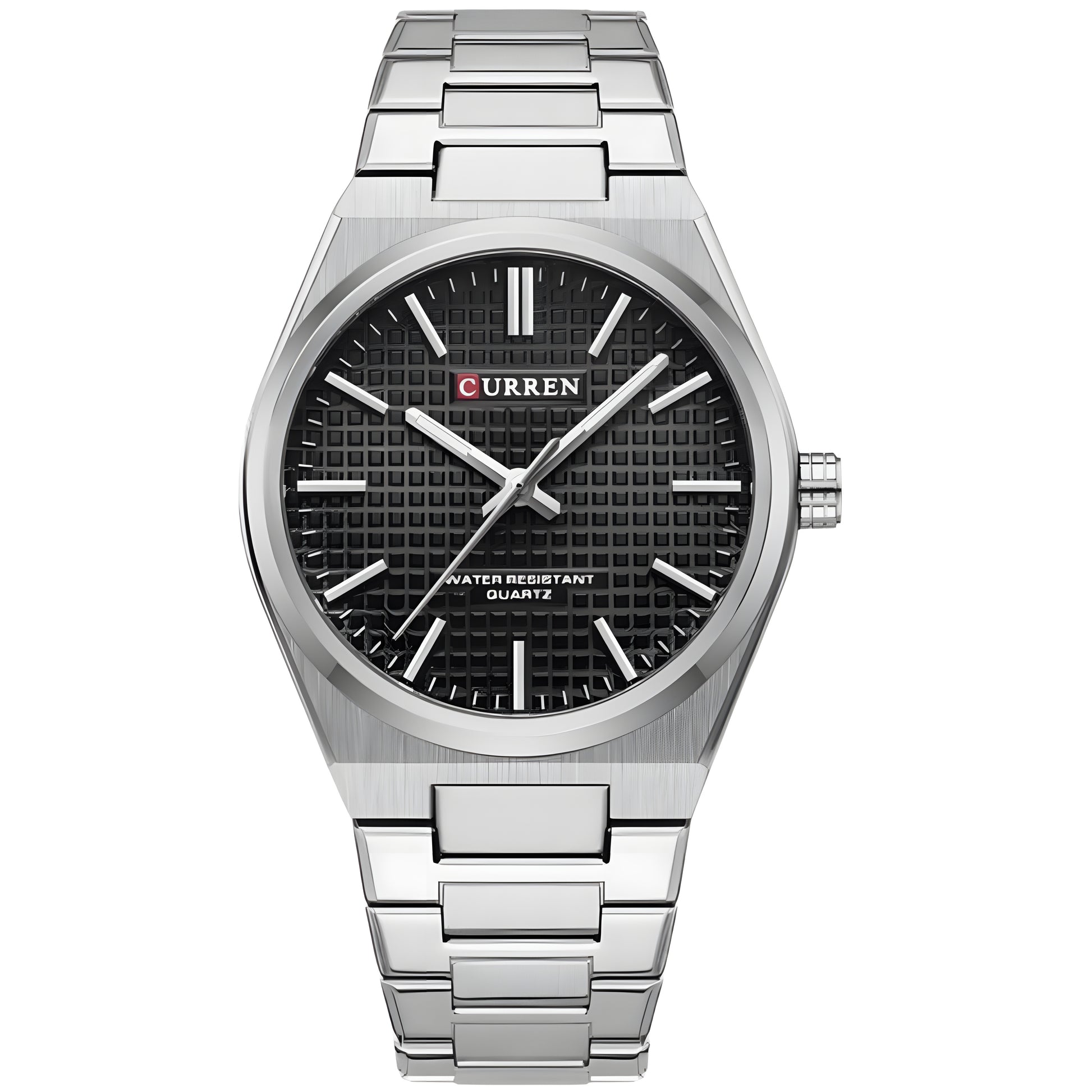 O Relógio Elegance é um clássico e sofisticado complemento que apresenta caixa em aço inoxidável prateado com detalhes que criam um contraste refinado. Seu mostrador texturizado, com marcadores lineares, destaca o design minimalista, enquanto o movimento quartz assegura precisão. Uma peça versátil ideal para quem valoriza o estilo tradicional com uma aparência contemporânea.
